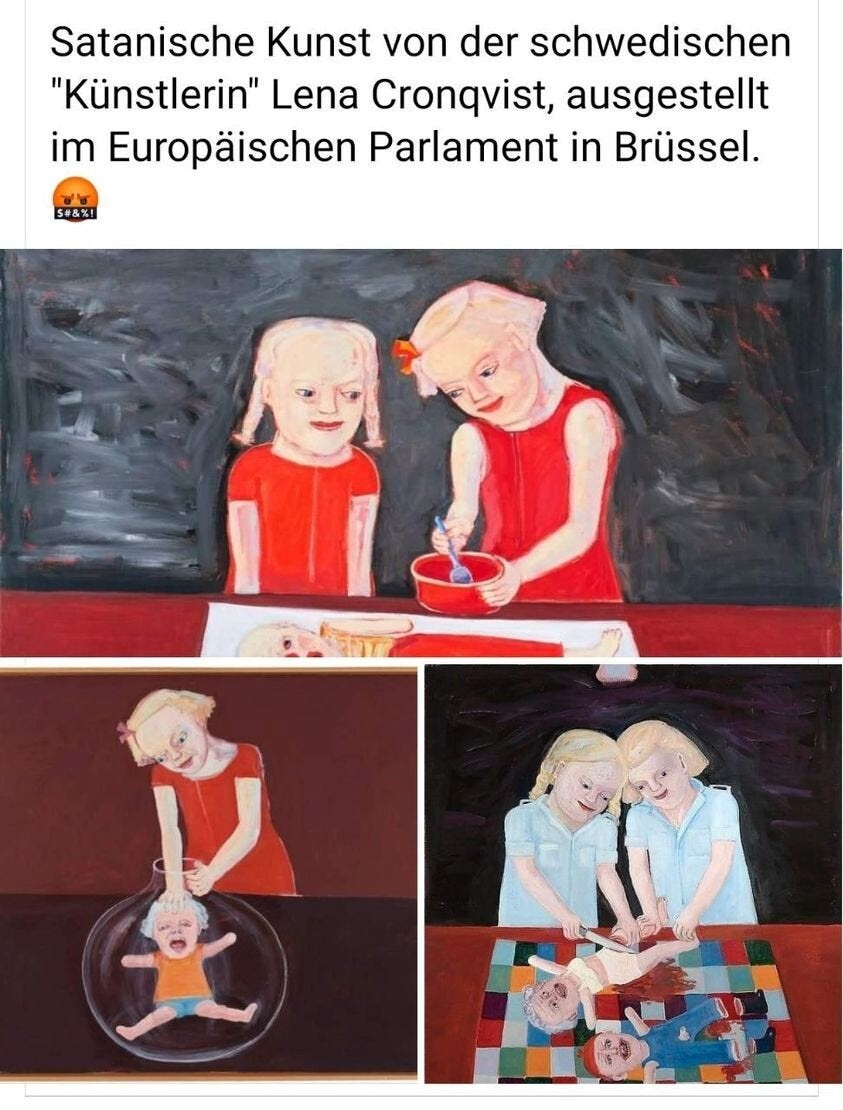 Lena Birgitta Cronqvist Tunström svéd festő, grafikus és szobrász alkotásai jelenleg az Európai Parlament brüsszeli folyosóin láthatók. Ezek a rendkívül megkérdőjelezhető alkotások, amelyeket egy olyan művész készített, akit félreismerhetetlenül ihletett a rituális gyerekáldozat, ezt mindenki jól láthatja, aki ott jár.